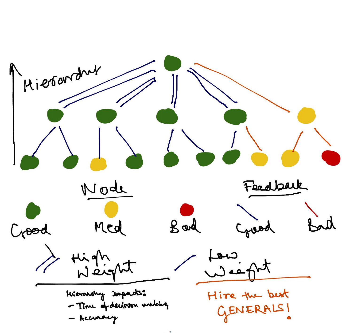 Non-flat structures are slow to reach changes in the market and the feedbacks are either lost or very slow to incorporate. Feedback are the lines connecting the nodes and as we move to pyramidal structure, speed as well as accuracy gets lost. Imagine one node taking a decision for the entire company vs ten nodes making decisions - faster reaction time, decisions with more feedback, and even if you fail you have time to iterate.